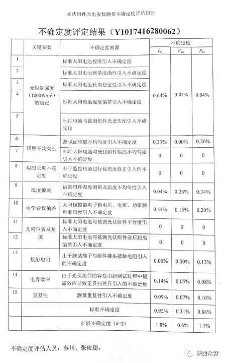 高效組件測(cè)試新高度 | 1.7%測(cè)量不確定度光伏組件的性能評(píng)估直接影響電站的發(fā)電效率以及運(yùn)行狀況,因此光伏組件光電參數(shù)測(cè)量顯得尤為重要 2018-08-25 光伏組件的性能評(píng)估直接影響電站的發(fā)電效率以及運(yùn)行狀況,因此光伏組件光電參數(shù)測(cè)量顯得尤為重要,但如何評(píng)定測(cè)試結(jié)果的可信度呢?還需要根據(jù)測(cè)量不確定度來評(píng)定。測(cè)量不確定度可以反映測(cè)試的置信水平,不確定度越小,所測(cè)結(jié)果與被測(cè)對(duì)象的真實(shí)值越接近,不確定度越大,測(cè)量結(jié)果的可信度也越低。因此,使用更低測(cè)量不確定度的設(shè)備會(huì)得到更準(zhǔn)確的測(cè)量結(jié)果。 近日,眾森使用自主研發(fā)的太陽電池組件測(cè)試儀GIV-20A+,對(duì)72片PERC單晶組件的測(cè)試過程進(jìn)行了測(cè)量不確定度評(píng)定,評(píng)定結(jié)果為:最大功率的測(cè)量不確定度為1.7%。