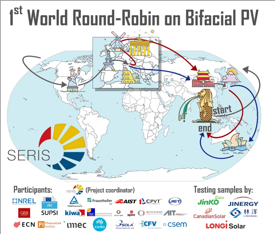 ————背景———— 世界雙面太陽能組件國(guó)際比對(duì)項(xiàng)目,是為了順應(yīng)光伏產(chǎn)業(yè)新技術(shù)特別是雙面技術(shù)的發(fā)展,由新加坡能源研究所(SERIS)組織,于2018年2月啟動(dòng),此次能力驗(yàn)證項(xiàng)目共有十三個(gè)國(guó)家和地區(qū)的著名研究機(jī)構(gòu)和實(shí)驗(yàn)室參與,其中包括著名實(shí)驗(yàn)室:NREL(美國(guó)國(guó)家可再生能源實(shí)驗(yàn)室),JRC(歐盟聯(lián)合研究中心),AIST(日本產(chǎn)業(yè)技術(shù)綜合研究所),F(xiàn)raunhofer(德國(guó)弗勞恩霍夫研究所)等。